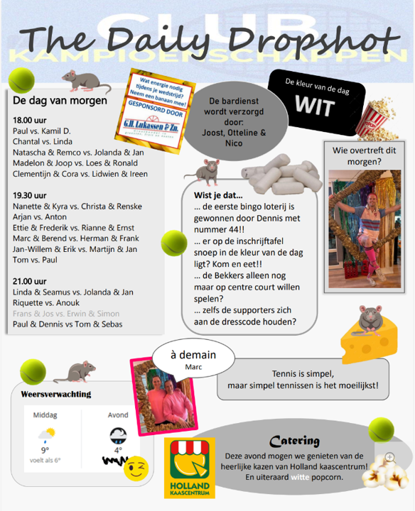 Het bingovel voor morgen is nog niet vol, dus kom morgen naar de baan en sla je slag. Maar ook om te komen kijken naar je clubgenoten en ze aan te moedigen, mocht je niet zelf de baan op gaan morgen.