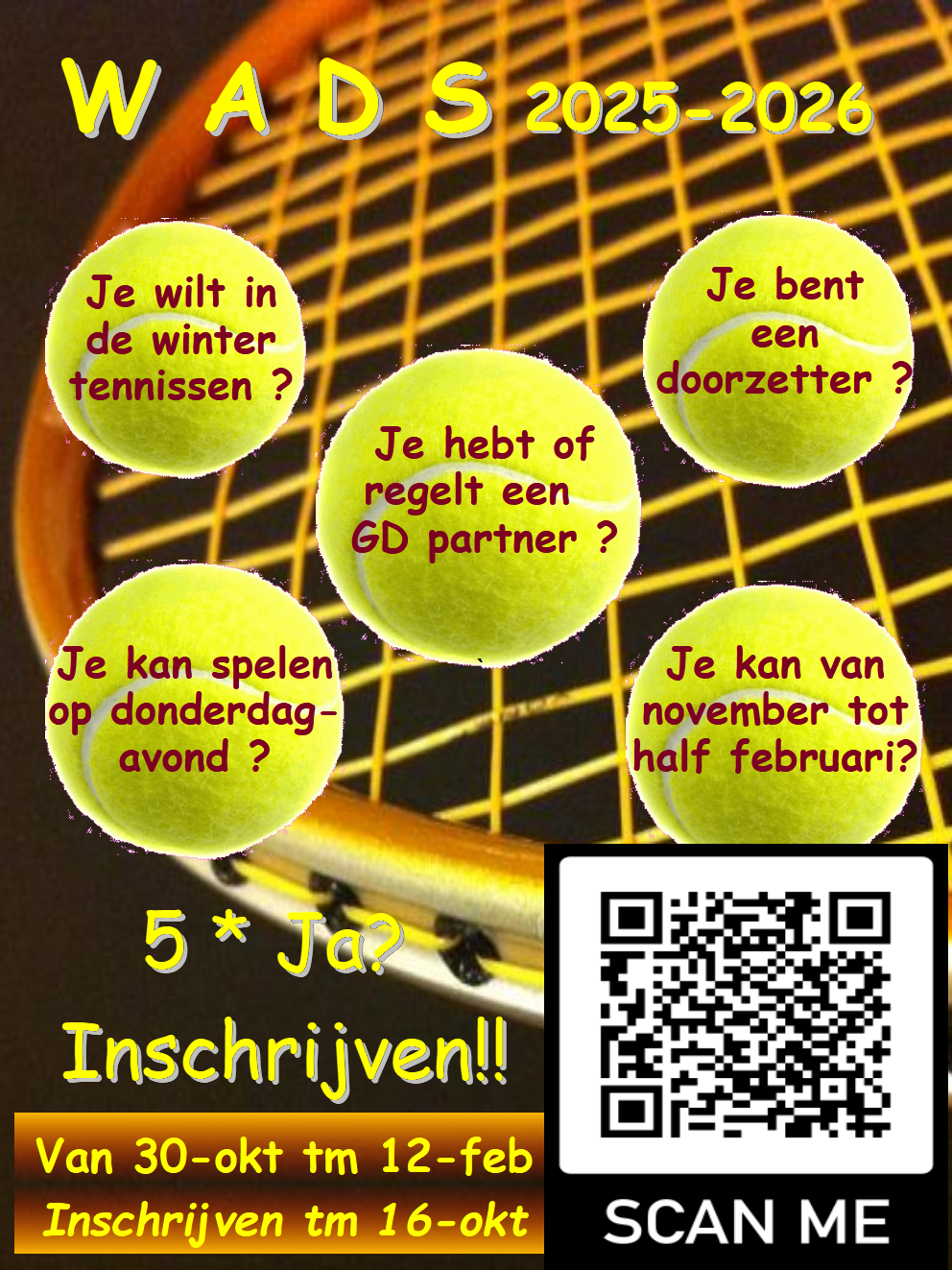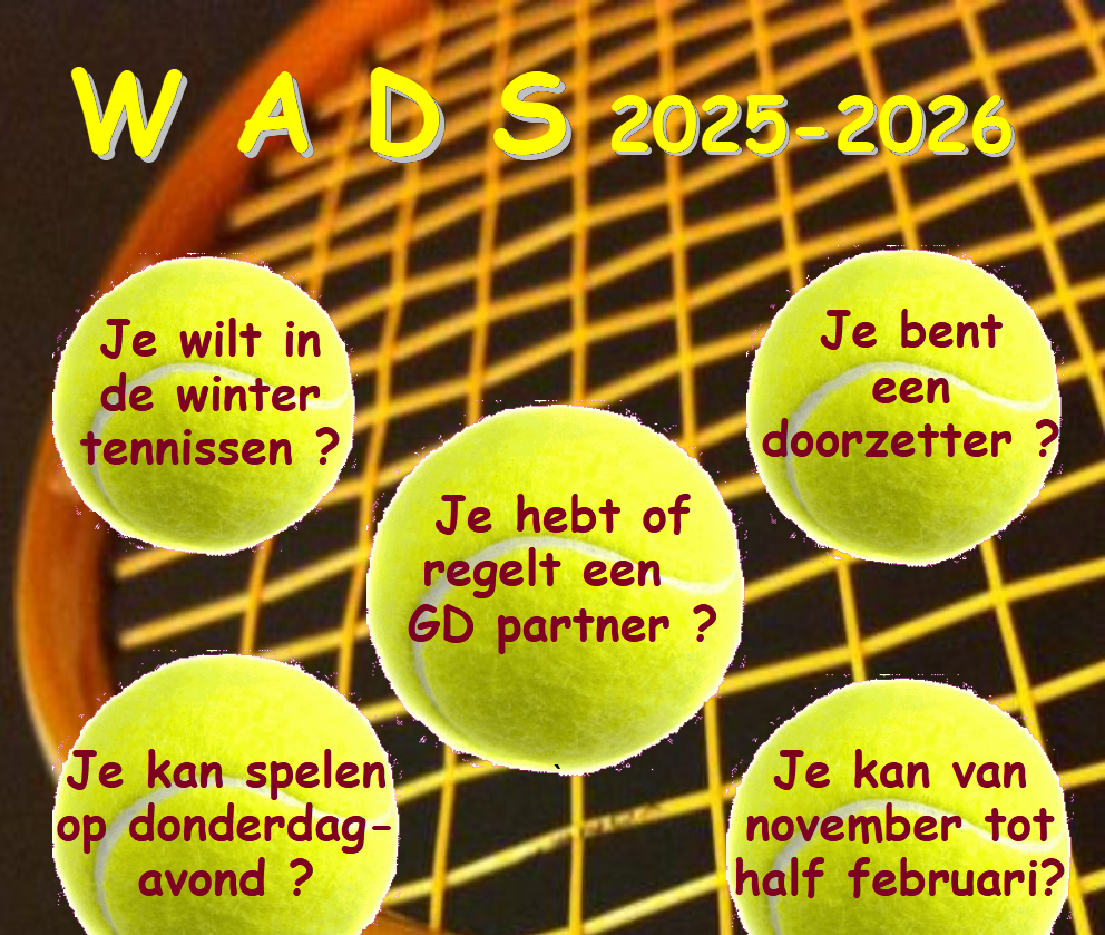Eindelijk, je kan weer inschrijven voor de WADS, je weet wel, ons Winter Avond Dubbel Spel toernooi voor leden die in de winter recreatief willen blijven spelen.