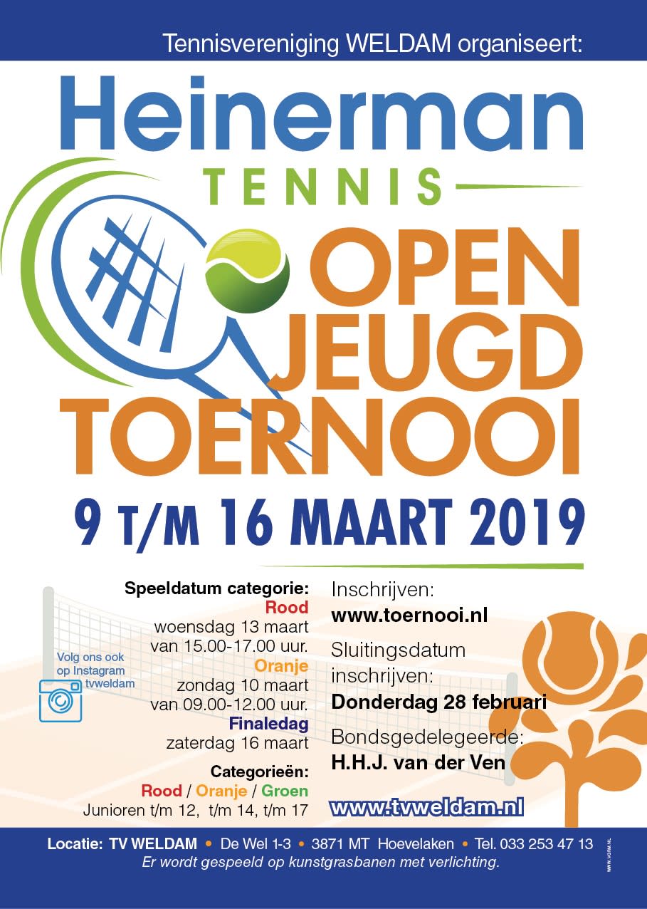 In maart 2019 organiseert TV Weldam Hoevelaken wederom het Heinerman Open Jeugd Toernooi. Inschrijven kan via toernooi.nl. Wij kijken weer uit naar een gezellig en sportief toernooi en zien jullie graag in maart bij ons op de tennisbaan!