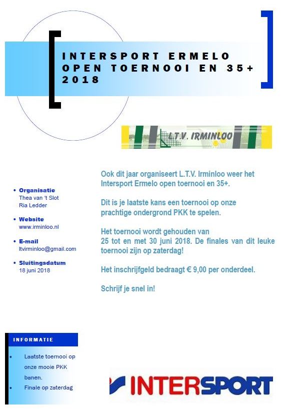 De inschrijving voor het Intersport Ermelo Open Toernooi en 35+ LTV Irminloo 2018 is weer geopend!