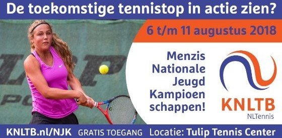 Van maandag 6 tot en met zaterdag 11 augustus 2018 zijn de banen van Tulip Tennisvereniging in Hilversum decor voor de strijd om de nationale enkel- en dubbelspeltitels van de Menzis Nationale Jeugd Kampioenschappen (NJK). Een unieke kans om top jeugdtennis te zien bij jou in de buurt! De toegang is alle dagen gratis. Bekijk hier de video van de Menzis NJK van vorig jaar.