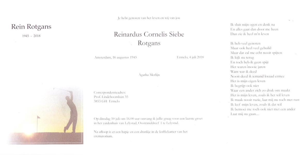 Op 4 juli j.l. is Rein Rotgans is in het Hospice rustig ingeslapen. Al vanaf 1975 was hij lid van onze tennisvereniging. Zijn afscheid is op dinsdag 10 juli in het Yardenhuis, Oostranddreef 1 te Lelystad. Leden van de vereniging worden hierbij uitgenodigd het afscheid van Rein bij te wonen.