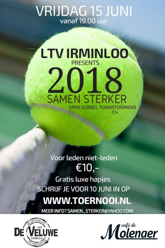 Vrijdag 15 juni is het weer zover! Het 2018 Samen Sterker Open Dubbel Tennistoernooi 17+ bij lTV Irminloo, voor leden en niet leden.