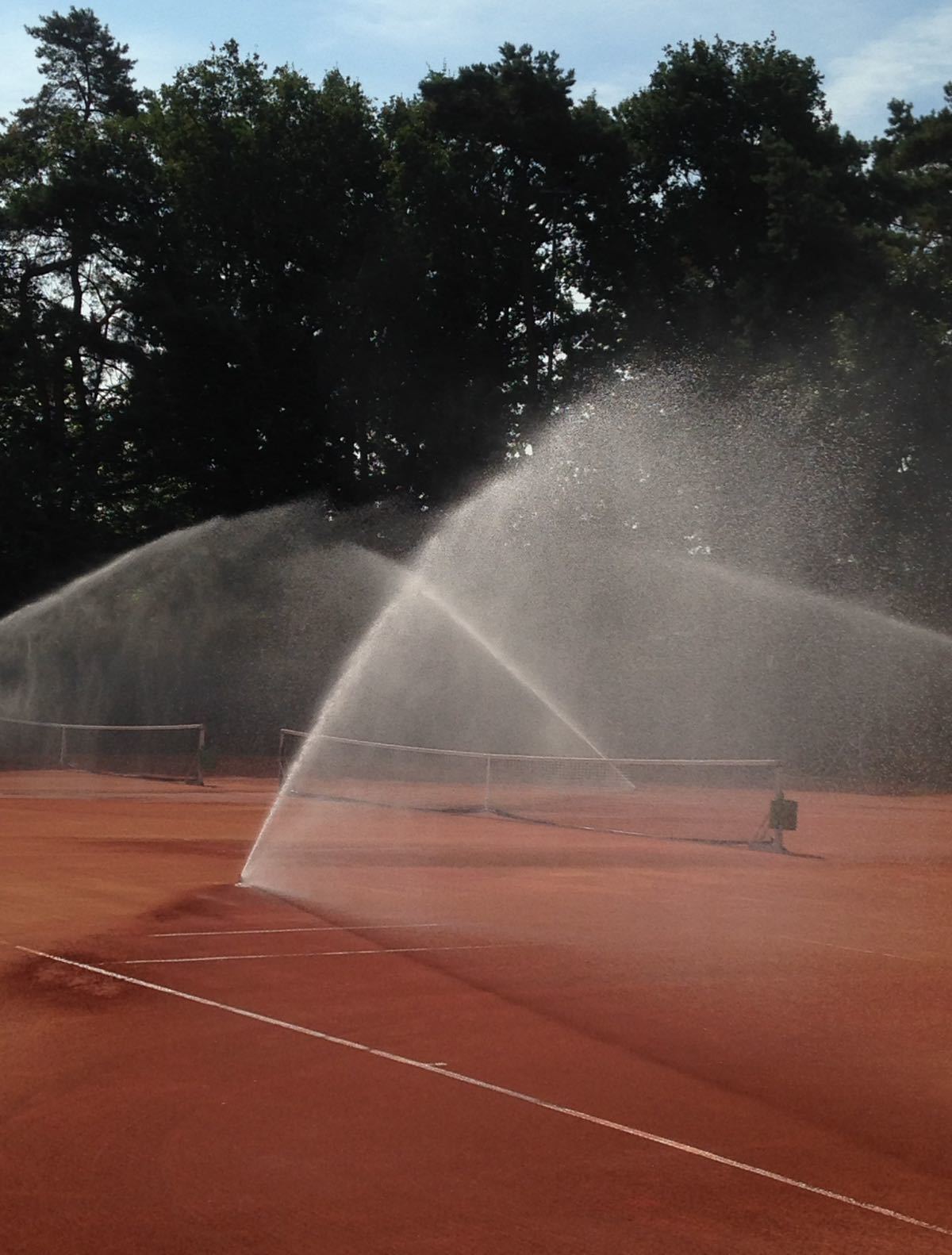 Er wordt op verschillende tijden automatisch beregend. Nu is dat op 7.30 uur en 12.00 uur. Daar zullen nog enkele momenten per dag bijkomen. Die momenten zullen naast het afhangbord worden aangegeven. De beregening gaat per baan en duurt per baan 2 minuten. Beginnend op baan 6 , en vervolgens per baan ernaast. Totale cyclus duurt dus 12 minuten.