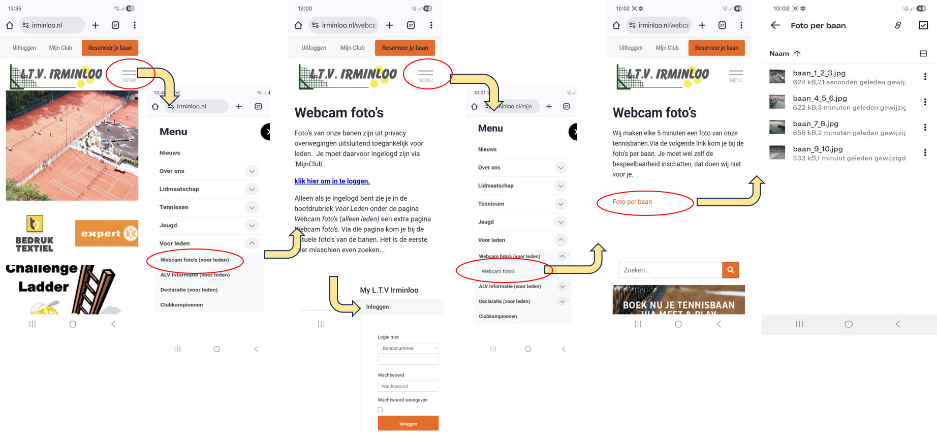 Alleen als je ingelogd bent zie je in de hoofdrubriek Voor Leden onder de pagina Webcam foto's (alleen leden) een extra pagina Webcam foto's. Via die pagina kom je bij de actuele foto's van de banen. Het is de eerste keer misschien even zoeken...